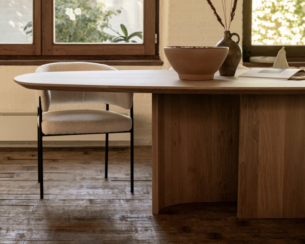 The collection consists of two dining tables; a semi-oval and a semi-round, also called teardrop-shaped. The gracefulness of the shape of the top is combined with a qonic and open central base, which creates a chic and modern appearance of the collection. The tables are made of French oak, available with different options, colors and sizes so that the tables can be tailored exactly to personal wishes.